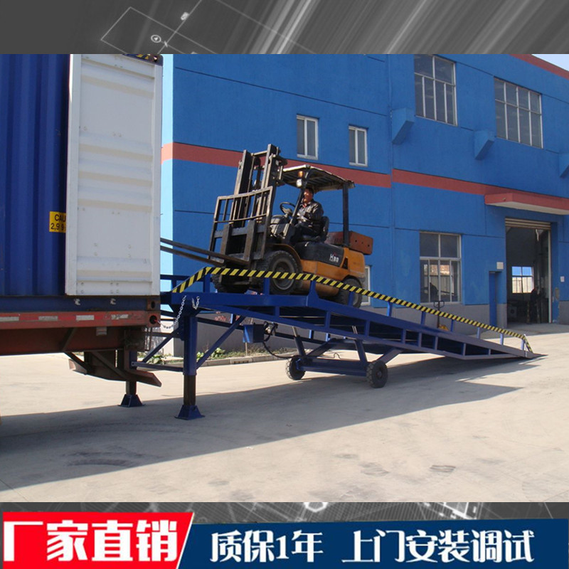 移動(dòng)式液壓登車(chē)橋是與叉車(chē)配合使用的貨物裝 卸專(zhuān)用輔助設(shè)備。有了它,叉車(chē)能直接從地面駛?cè)肫?chē)車(chē)廂內(nèi)部進(jìn)行 批量裝卸作業(yè)。